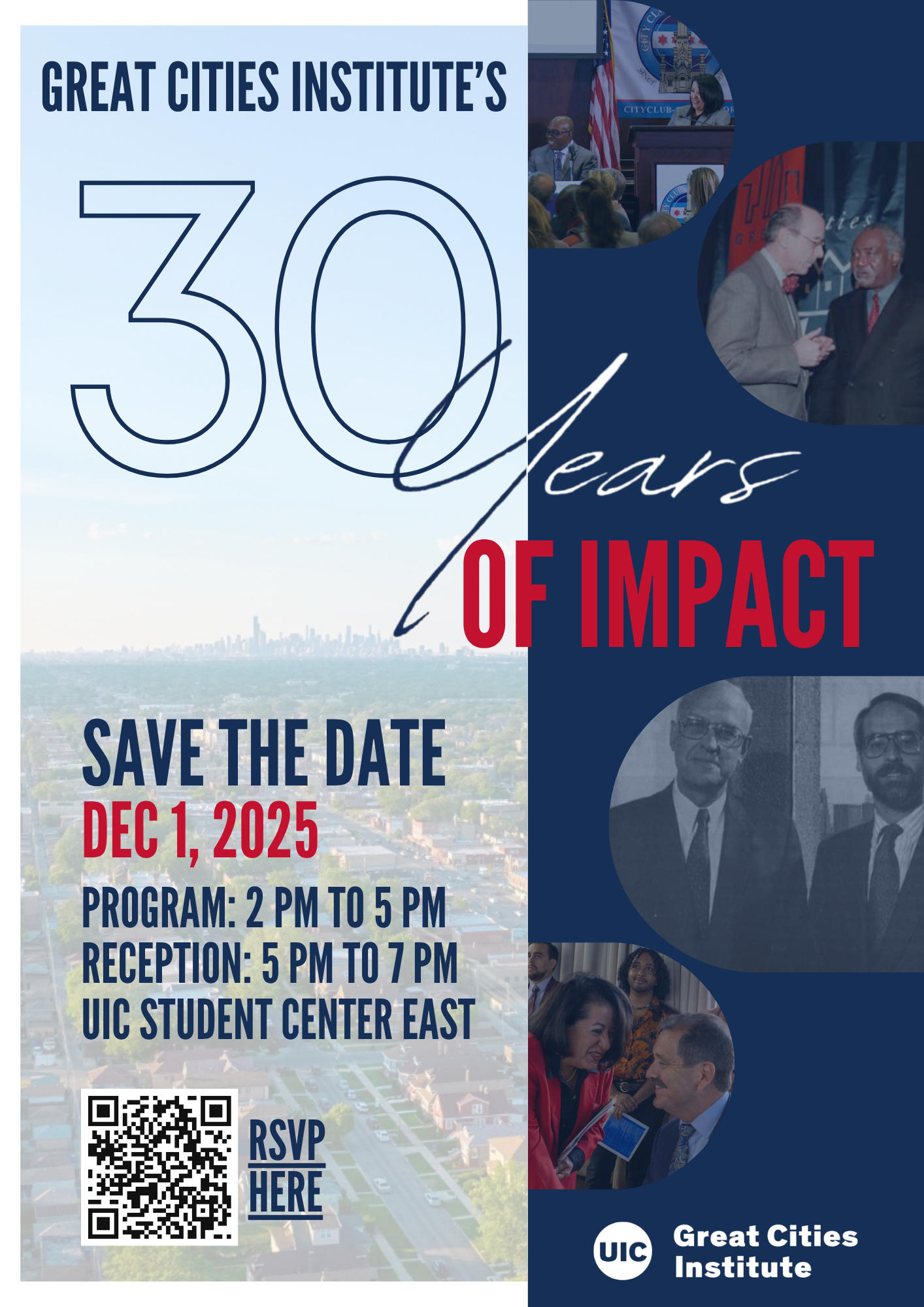 We are pleased to share a reminder that on December 1, 2025, we will celebrate the Great Cities Institute (GCI)’s 30 Years of Impact, marking three decades of commitment to urban research, policy, and community engagement. This milestone offers an opportunity to reflect on the vision that led to the founding of GCI and to honor the ongoing work that continues to shape cities and communities.